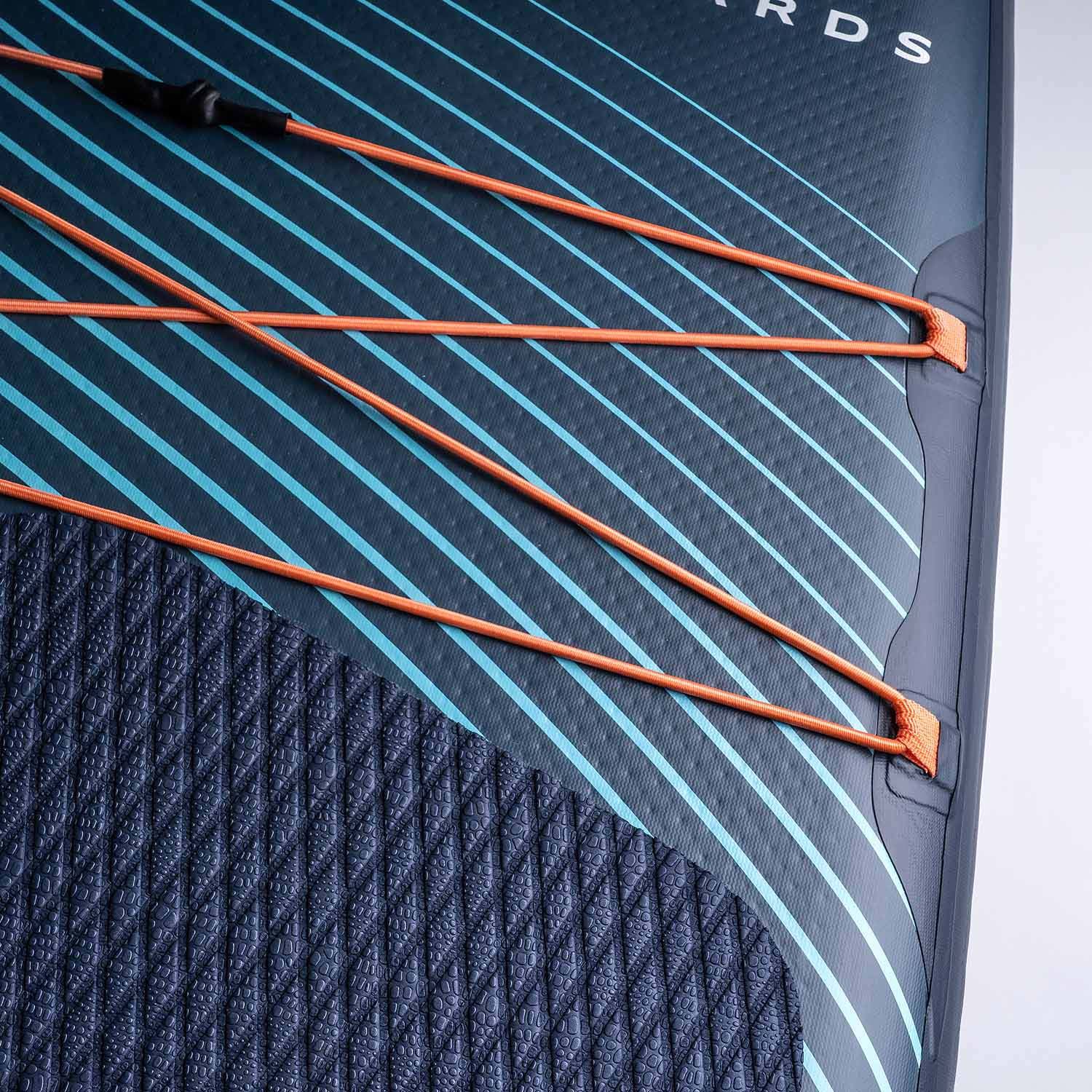 Das neue SUP bietet noch mehr Möglichkeiten. Verstärkte Gummi-Gepäckleinen ermöglichen es, noch mehr notwendige Dinge auf die Reise mitzunehmen. Ein spezieller Griff am Bug ermöglicht es, das Board schnell und problemlos aus dem Wasser zu ziehen, und der Griff in der Mitte des SUPs sorgt für einen bequemen Transport des Boards. Am Heck ist ein D-Ring zur Befestigung der Sicherheitsleine (Leash) sowie ein Ventil zum Aufpumpen des Boards angebracht.