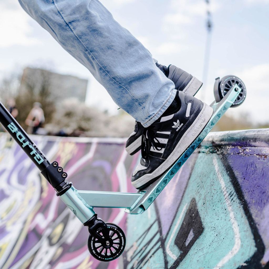 Das metallic-türkise Finish zieht alle Blicke im Skatepark auf sich. Dazu kommen das Movino-Schädelmuster an den Seiten und die türkisen Griffelemente. Mit dem Movino Glide erhalten deine Tricks eine neue Optik! Schau dir auch die anderen Farboptionen an: Gold, Neo-Chrome, Blau und Rot.