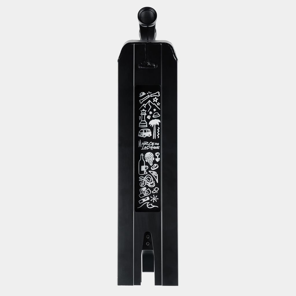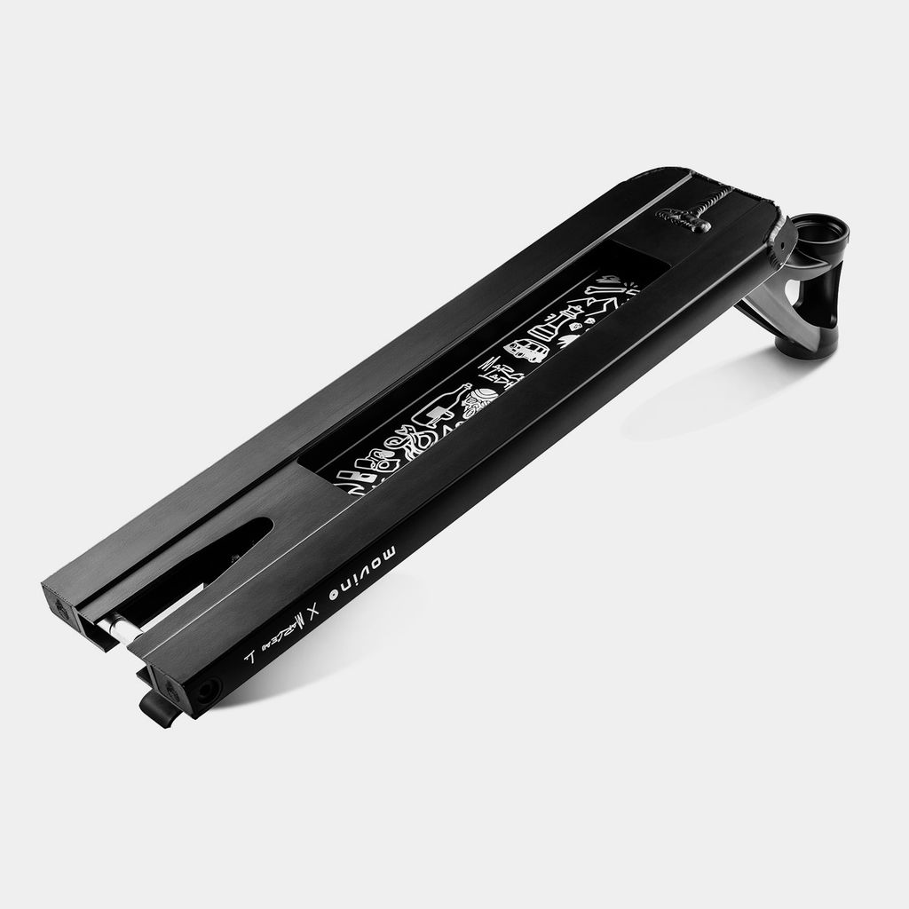 Das Deck, auf dem die Profis fahren, wurde aus hochwertigem Aluminium gefertigt. Kompatibel mit dem integrierten Kompressionssystem IHC, mit eckiger Grundform und einer Öffnung an der Unterseite für die richtige Balance des Scooters, ermöglicht es das Überwinden aller Hindernisse und das Ausführen komplizierter Tricks. Auffällig ist die interessante Grafik, die thematisch an Marceaus Reisen erinnert.