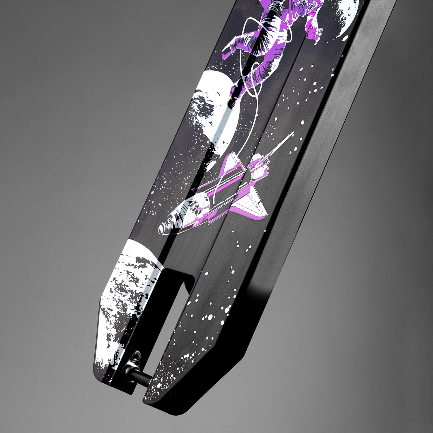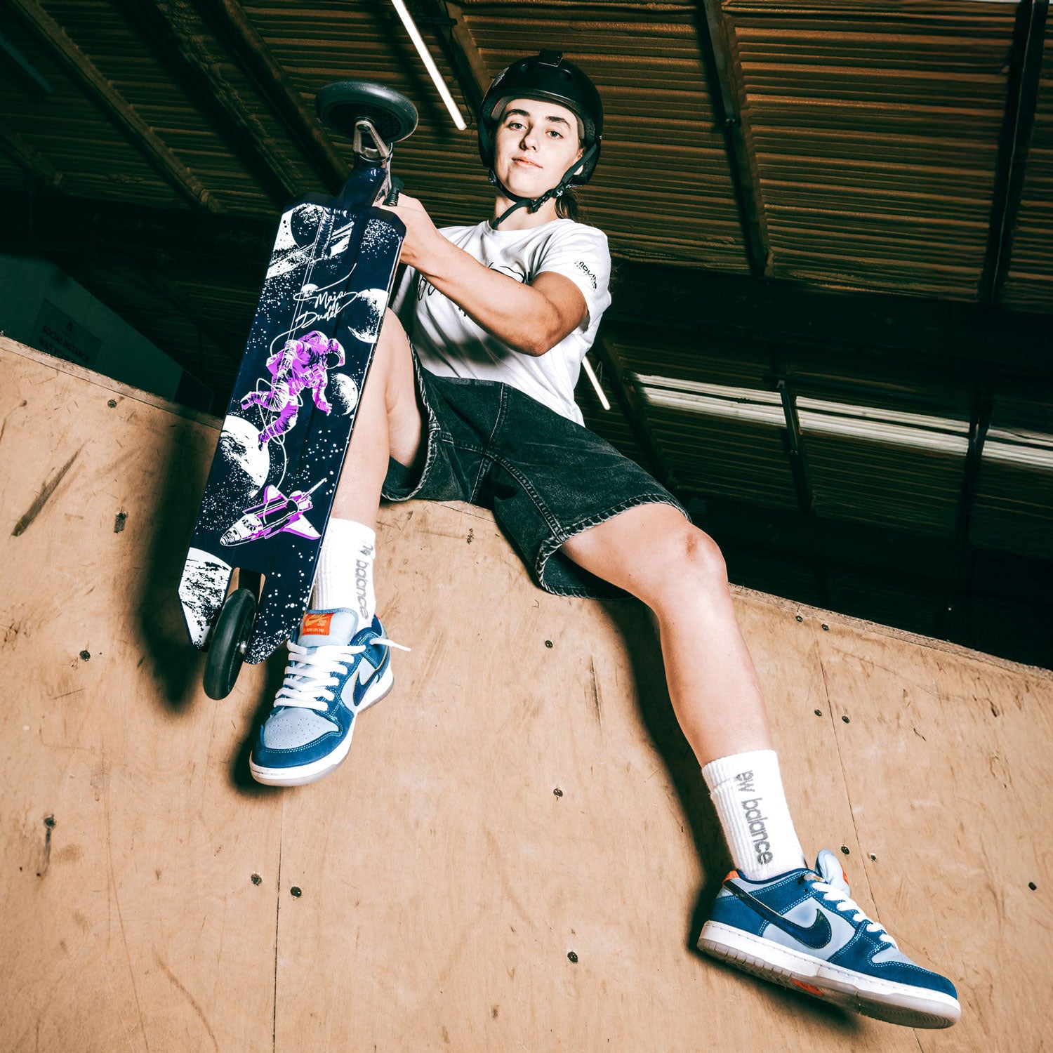 Im Flug ist jedes Detail goldwert. Deshalb hat Majas Park-Deck die von ihr gewählten Maße von 48 cm Länge und 12,5 cm Breite erhalten – bei einem Gewicht von nur 1,34 kg! Mit diesen Parametern lassen sich Tricks fast wie in der Schwerelosigkeit drehen.