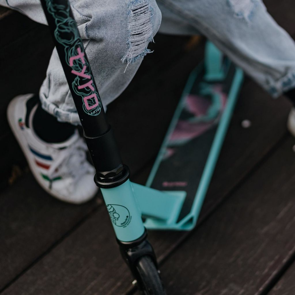 Der erste Stuntscooter? Unsere Antwort ist das Modell Movino Tyro! Dieses Modell wurde in Zusammenarbeit mit professionellen Fahrern der Movino-Teams entwickelt und ist in gleich vier Farbvarianten erhältlich. Das türkisfarbene Deck mit einem wilden Drachen, pinke Griffe und Details an den Rollen ziehen alle Blicke auf sich. So müssen Sie bei der Wahl des ersten Stuntscooters weder auf Qualität noch auf Design verzichten.