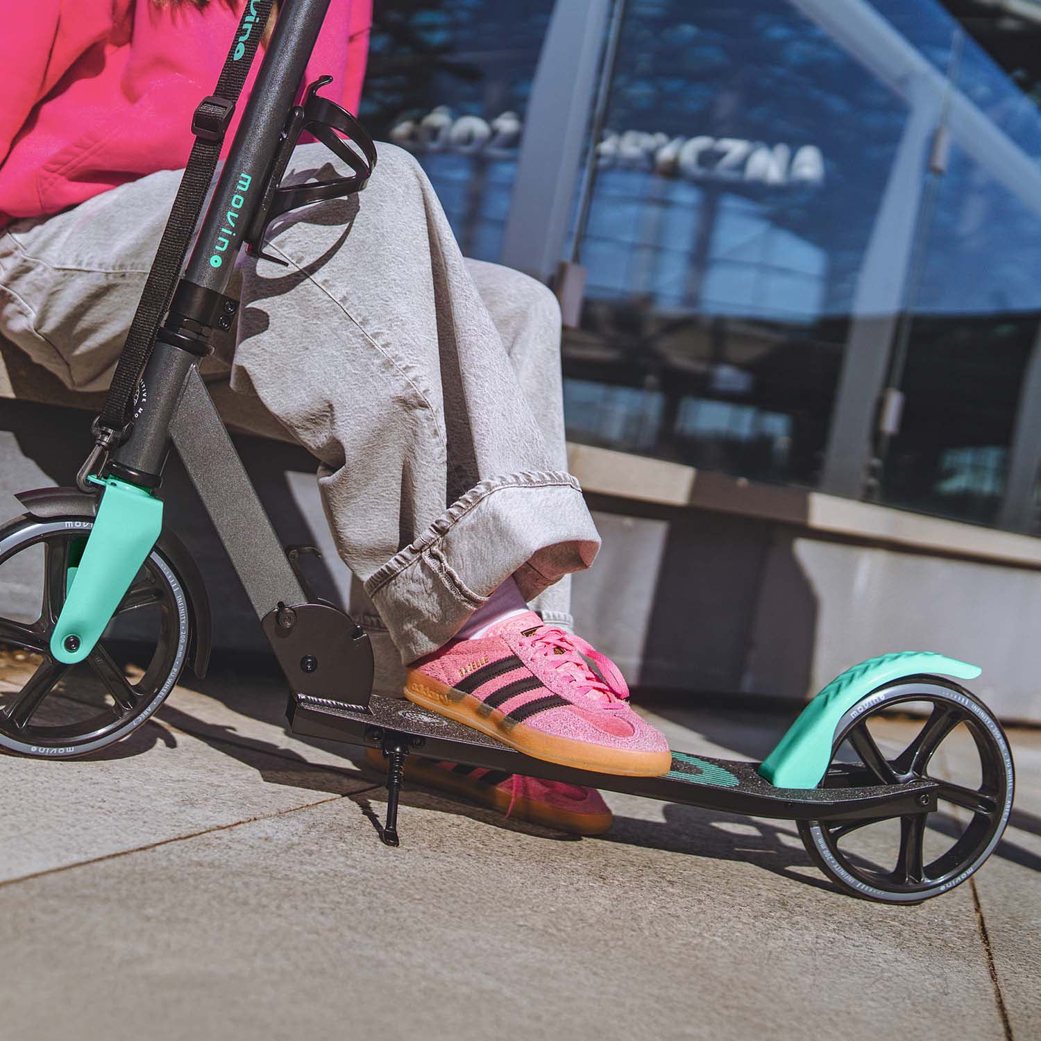 When riding the Infinity scooter, you’ll always have your favourite drink close at hand. The clever bottle holder mounted on the handlebar column is a very convenient feature. And it’s not the only one! The Movino Infinity also comes with a practical carrying strap. You can’t ride the scooter everywhere, and sometimes you need to carry it. The model’s low weight—only 3.5 kg—and the adjustable strap make this task easy. It can be slung over your shoulder like a bag!