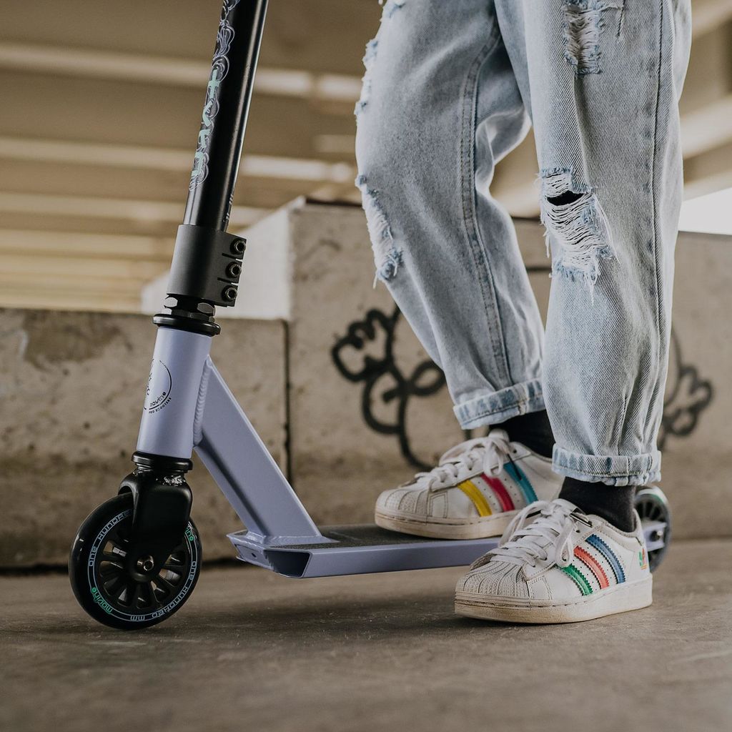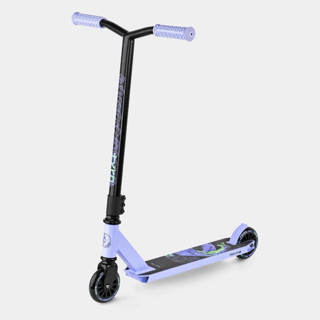 Het Movino Tyro model is precies waar de passie voor stuntsteps begint! De specificaties, ontwikkeld met hulp van professionele riders uit het Movino-team, zijn beschikbaar in vier kleurvarianten. Het lila deck en de handgrepen, samen met de felle drakengrafiek, trekken alle blikken naar zich toe. Op zoek naar je eerste step? Dan hoef je niet meer te kiezen tussen kwaliteit en design.